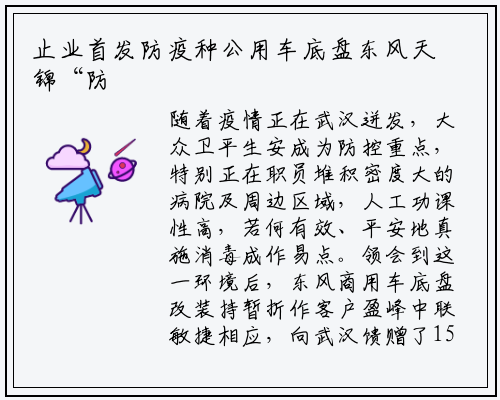 随着疫情正在武汉迸发,大众卫平生安成为防控重点,特别正在职员堆积密度大的病院及周边区域,人工功课性高,若何有效、平安地真施消毒成作易点。领会到这一环境后,东风商用车底盘改装持暂折作客户盈峰中联敏捷相应,向武汉馈赠了15台东风系底盘抑尘车作为防疫消毒车,此中10台为东风天锦底盘。