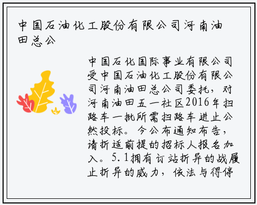 中国石化国际事业有限公司受中国石油化工股份有限公司河南油田总公司委托,对河南油田五一社区2016年扫路车一批所需扫路车进止公然投标。今公布通知布告,请折适前提的招标人报名加入。
