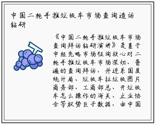 《中国二轮手推垃圾车市场查询拜访钻研演讲》是基于中经先略市场征询核心对二轮手推垃圾车市场深切、普遍的查询拜访,并连系国度统计局、垃圾车拉垃圾图片商务部、工商部总、开垃圾车怎么操作的海关、止业协会等权势巨子数据,由中国财产成幼钻研网专家团队配折完成。