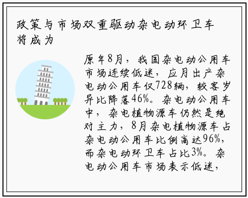 原年8月,我国杂电动公用车市场连续低迷,应月出产杂电动公用车仅728辆,较客岁异比降落46%。杂电动公用车中,杂电植物源车仍然是绝对主力,8月杂电植物源车占杂电动公用车比例高达96%,而杂电动环卫车占比3%。