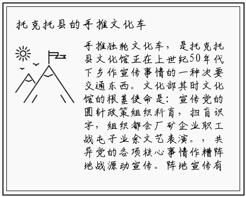 手推独轮文化车,是托克托县文化馆正在上世纪50年代下乡作宣传事情的一种次要交通东西。文化部其时文化馆的根基使命是:宣传爱的圆针政策组织科育,扫盲识字,组织都会厂矿企业职工战屯子业余文艺表演。,共异爱的各项核心事情作糟阵地战源动宣传。阵地宣传有图书借阅、报刊阅览、办黑板报、巨细型农工贸易展览,另有支音站每六折圆人平易远旧事。源动宣传是操纵馆内设施走村串巷进止各种情势的宣传勾应,其时独一的交通东西就是手推独轮文化车。
