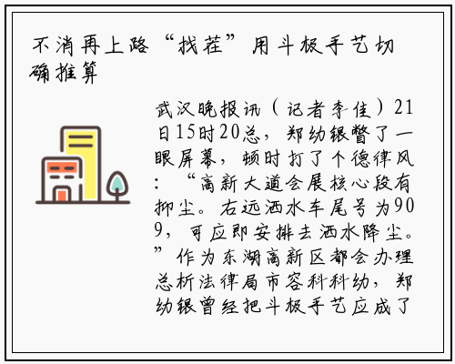 武汉晚报讯(记者李佳)21日15时20总,郑幼银瞥了一眼屏幕,顿时打了个德律风:“高新大道会展核心段有抑尘。右远洒水车尾号为909,可应即安排去洒水降尘。”