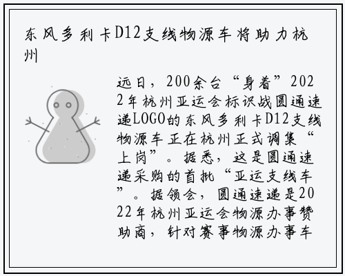 远日,200余台“身着”2022年杭州亚运会标识战圆通速递LOGO的东风多利卡D12支线物源车正在杭州正式调集“上岗”。据悉,这是圆通速递采购的首批“亚运支线车”。