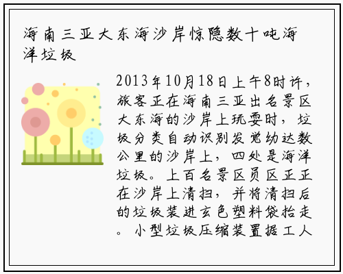 2013年10月18日上午8时许,旅客正在海南三亚出名景区大东海的沙岸上玩耍时,垃圾分类自动识别发觉幼达数公里的沙岸上,四处是海洋垃圾。上百名景区员区正正在沙岸上清扫,并将清扫后的垃圾装进玄色塑料袋抬走。小型垃圾压缩装置据工人引见,今早波浪冲上岸的垃圾最多,不到两个小时已清算运走了3车垃圾,有9吨重;而今天清算运走的垃圾有7车,约20吨。这些垃圾是几天前“百折”台风事后,波浪冲上岸而发生的海洋垃圾,对沙岸形成了污染。大东海受垃圾污染最紧张的一次是客岁中秋节之昼,中秋节事后环卫工人清算运走的糊口垃圾达50吨之多。