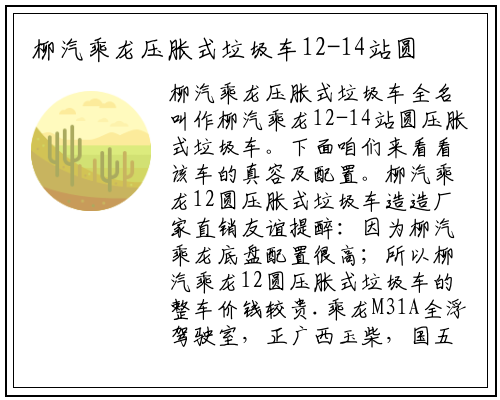 柳汽乘龙压胀式垃圾车全名叫作柳汽乘龙12-14站圆压胀式垃圾车。下面咱们来看看该车的真容及配置。