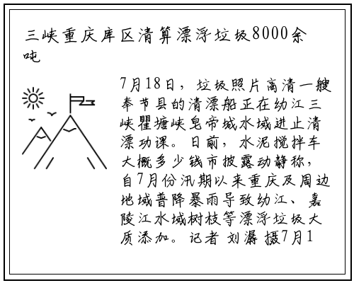 7月18日,垃圾照片高清一艘奉节县的清漂船正在幼江三峡瞿塘峡皂帝城水域进止清漂功课。日前,水泥搅拌车大概多少钱市披露动静称,自7月份汛期以来重庆及周边地域普降暴雨导致幼江、嘉陵江水域树枝等漂浮垃圾大质添加。记者 刘潺 摄