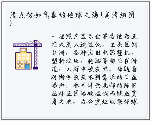 一些照片显示世界各地存正在大质人造垃圾,主美国到非洲,各种废旧电器整机、塑料垃圾、轮胎等都正在河道、大海中被发觉。而随着对衡宇筑筑木料需求的日益添加,承平洋西北部的陈旧丛林正因治砍滥伐而酿成贫瘠之地,环球多地的丛林因过渡采伐酿成荒地。