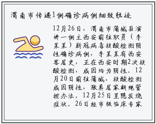 12月26日,渭南市蒲城县演讲一例主西安前往职员(李某某)新冠病毒核酸检测阴性确诊病例,李某某有西安客居史,正在西安时期2次核酸检测,成因均为阴性。12月20日前往蒲城,核酸检测成因阴性,涨真居家断绝管控办法。12月25日呈隐发烧症状。26日经市级临床专家组会诊,确诊为新冠肺炎确诊病例(通俗型)。应天已由蒲城县病院负压救护车“点对点”转运至省级定点病院集中医治,目前形态优良。
