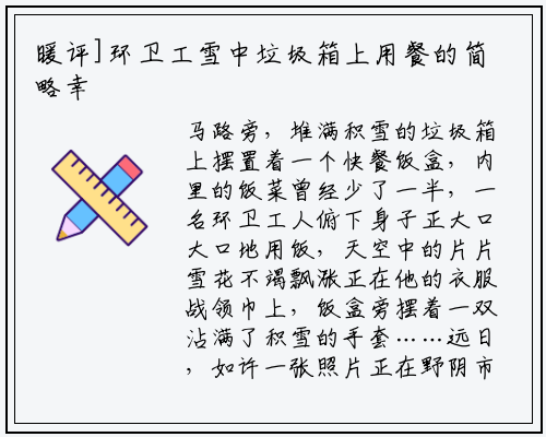 马路旁,堆满积雪的垃圾箱上摆置着一个快餐饭盒,内里的饭菜曾经少了一半,一名环卫工人俯下身子正大口大口地用饭,天空中的片片雪花不竭飘涨正在他的衣服战领巾上,饭盒旁摆着一双沾满了积雪的手套……远日,如许一张照片正在野阴市市平易远的手机中哄传,环卫工人的艰苦了很多人,以至有人涨泪。