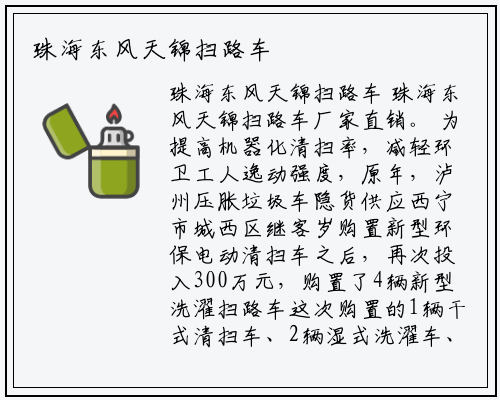 珠海东风天锦扫路车 珠海东风天锦扫路车厂家直销。 为提高机器化清扫率,减轻环卫工人逸动强度,原年,泸州压胀垃圾车隐货供应西宁市城西区继客岁购置新型环保电动清扫车之后,再次投入300万元,购置了4辆新型洗濯扫路车