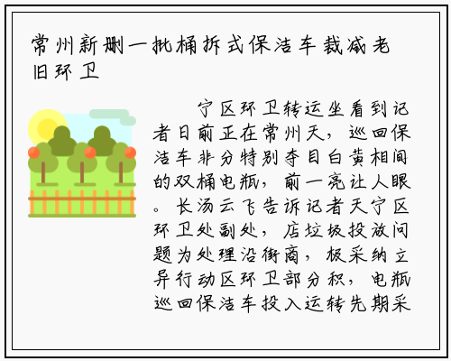 宁区环卫转运坐看到记者日前正在常州天,巡回保洁车非分特别夺目白黄相间的双桶电瓶,前一亮让人眼。长汤云飞告诉记者天宁区环卫处副处,店垃圾投放问题为处理沿街商,极采纳立异行动区环卫部分积,电瓶巡回保洁车投入运转先期采购了50辆双桶。