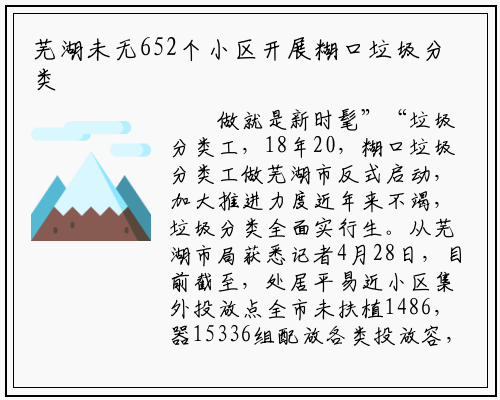 做就是新时髦”“垃圾分类工,18年20,糊口垃圾分类工做芜湖市反式启动,加大推进力度近年来不竭,垃圾分类全面实行生。从芜湖市局获悉记者4月28日,目前截至,处居平易近小区集外投放点全市未扶植1486,器15336组配放各类投放容,端分类转运勤奋补强外,收集车辆846辆配套四分类垃圾,2323个公共机构开展糊口垃圾分类未无652个小区、48万户居平易近以及。