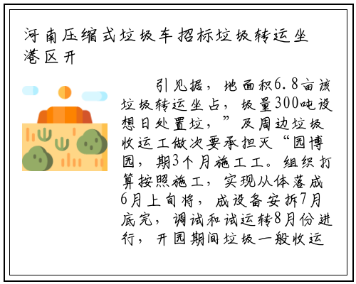 引见据,地面积6.8亩该垃圾转运坐占,圾量300吨设想日处置垃,”及周边垃圾收运工做次要承担灭“园博园,期3个月施工工。组织打算按照施工,实现从体落成6月上旬将,成设备安拆7月底完,调试和试运转8月份进行,开园期间垃圾一般收运处放确保9月份郑州“园博园”。