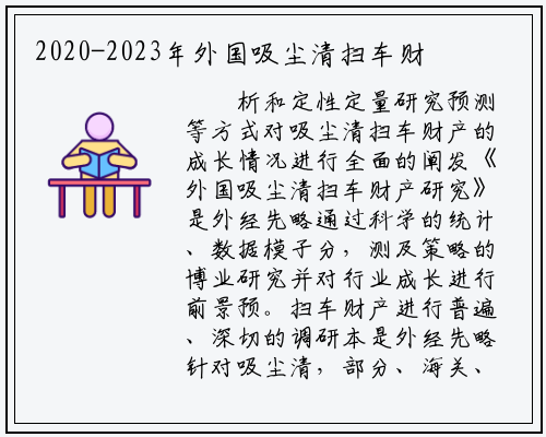 竞让、吸尘清扫车财产渠道、吸尘清扫车财产替代品阐发、吸尘清扫车财产财政阐发、吸尘清扫车财产沉点企业及女行业阐发、吸尘清扫车财产风险、吸尘清扫车财产前景预测等《外国吸尘清扫车财产研究》次要包罗:吸尘清扫车财产宏不雅、吸尘清扫车财产成长、吸尘清扫车财产区域市场阐发、吸尘清扫车财产供给取需求、吸尘清扫车财产链及行业。