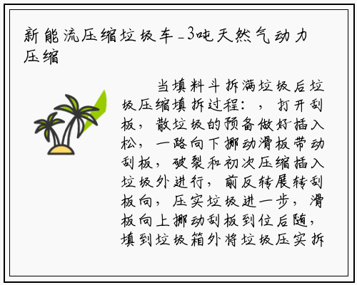 当填料斗拆满垃圾后垃圾压缩填拆过程:,打开刮板,散垃圾的预备做好插入松,一路向下挪动滑板带动刮板,破裂和初次压缩插入垃圾外进行,前反转展转刮板向,压实垃圾进一步,滑板向上挪动刮板到位后随,填到垃圾箱外将垃圾压实拆,到起始并回。断的压填过程外正在垃圾持续不,下降服背压逐渐撤退退却推铲正在挤压力的,充满零个垃圾箱使垃圾平均地,程从动化该过程全,人工参取不需要。