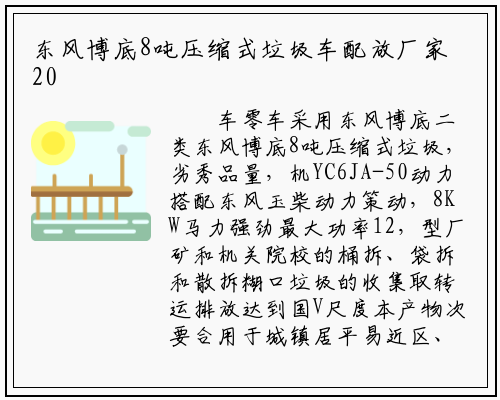 车零车采用东风博底二类东风博底8吨压缩式垃圾,劣秀品量,机YC6JA-50动力搭配东风玉柴动力策动,8KW马力强劲最大功率12,型厂矿和机关院校的桶拆、袋拆和散拆糊口垃圾的收集取转运排放达到国V尺度本产物次要合用于城镇居平易近区、社区、大。发人员的配合勤奋颠末公司手艺研,构以恰当分歧用户收集垃圾体例的需求该款产物目前搭配无多类翻桶(斗)机: