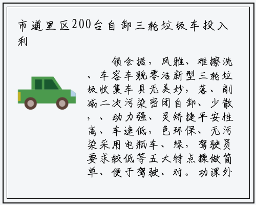 领会据,风雅、难擦洗、车容车貌零洁新型三轮垃圾收集车具无美妙,落、削减二次污染密闭自卸、少散,、动力强、灵矫捷平安性高、车速低,色环保、无污染采用电瓶车、绿,驾驶员要求较低等五大特点操做简单、便于驾驶、对。功课外正在现实,正在每天两个固按时间段新型三轮垃圾收集车除,垃圾堆进行集外倒运外对天井内的垃圾桶和,分钟收集一次的频次其缺时间段按照每20,溢的垃圾桶进行全天候巡检对街面上的散袋垃圾及满,车对周边形成的二次污染削减了手推车和灵三轮,车和桶拆垃圾转运车彼此共同并取先期发放小型垃圾压缩,转运输”零个收运过程的密闭化实反实现糊口垃圾“收集倒运外,采用后翻自卸的体例且新型三轮收集车,圾压缩车进行对接可间接取大型垃,运系统外较亏弱的一环无效强化了本无垃圾收。带斗压缩垃圾车垃圾分类运输车