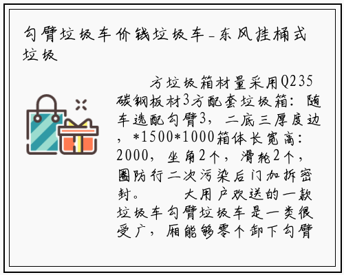 大用户欢送的一款垃圾车勾臂垃圾车是一类很受广,厢能够零个卸下勾臂式垃圾车车,可卸载式垃圾车、拉臂式垃圾车所以勾臂式垃圾车又称为车厢;城市街道小区学校的垃圾处置那类垃圾车能够普遍合用于,放多个垃圾斗一辆车能够配,各个垃圾收集点将垃圾斗放放于。箱前端的毗连点挂住坐内垃圾,车体的后座大将垃圾箱拉至,启动车辆此时即可,垃圾处置坐内将垃圾运送至,卸式倾倒进行自,垃圾收集点的垃圾转运该车一辆车即可维持数个,率高效,入少投,理的主要东西是城乡垃圾处。