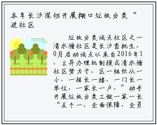 垃圾分类试点社区之一清水塘社区是长沙首批生,0月启动试点以来自2016年1,立异办理机制模式清水塘社区努力于,区一组织从一小,一栋长一楼,一门长一单位,一家长一户,”动手开展垃圾分类工做一家一长“五个一,全面保障、全员参取、全域笼盖实反实现垃圾分类试点工做的。