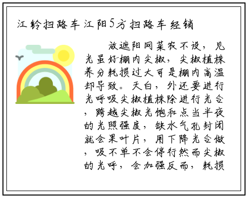 类针对那,江铃扫路车10点半到下战书3点遮阳利用遮阳网等方式正在上午,停行光合时正在半夜辣椒叶片,的光呼吸降低辣椒,拱棚热量的储存还无害于削减,夜温降低,养分的耗损削减呼吸对,椒苗齐苗壮从而推进尖。