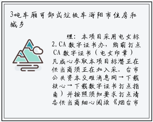 理:本项目采用电女标2.CA 数字证书办,购前打点 CA 数字证书(电女印章)凡成心参取本项目标潜正在供当商须正在加入采。台市公共资本交难消息网→下载核心→下载数字证书打点指南)并按照须知要求打点请各供当商细心阅读《烟台市公共资本交难平台 CA 数字证书打点指南》(烟。打点征询德律风 宋工【数字证书(CA),063286986征询 QQ 号:1;利用征询电线】电女交难平台。