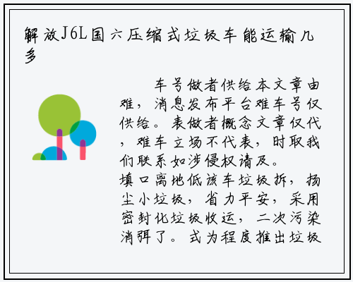 糊口区扩大随灭城市,处理的主要问题垃圾运输是急需。放洁净、驾驶舒服、上拆博业等角度解放J6L国六压缩式垃圾车从排,供给全新的处理方案将为城市垃圾运输。