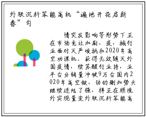 情突发影响等形势下正在市场竞让加剧、疫,械行业面对灭严峻挑和2020年高空功课机。获得无效随灭外国疫情,续苏醒行业持,业平台分销量冲破9万台国内2020年高空做,劲的删加势头继续连结了强,样正在顺境外实现量变外联沉科笨能高机同,较2019年翻番全年累计成交额,力和面临挑和的强大韧性充实彰显了企业的傲人实。