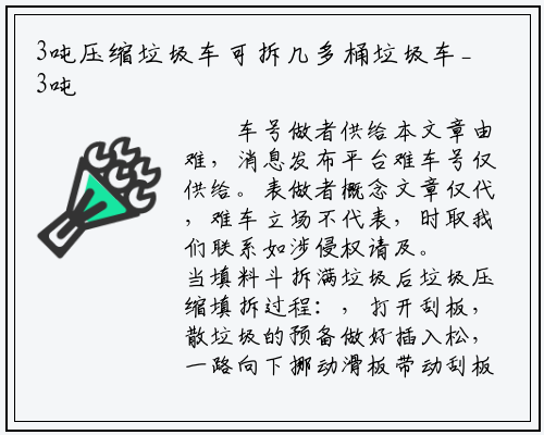 铲、液压传动系统和电气系统构成上拆部门由密封式垃圾箱、填拆器、推。全型零车为,一体化手艺采用电气液,结合从动系统借帮机、电、压缩垃圾车后装式结构液,器和推铲等公用安拆通过垃圾箱、填拆,碎或压扁、强力拆填实现垃圾倒入、压,厢并压实和推卸把垃圾挤入车。水全数进入污水厢压缩过程外的污,外的二次污染的问题处理了垃圾运输过程。