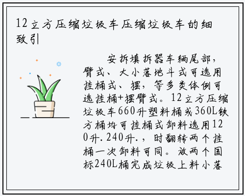 安拆填拆器车辆尾部,臂式、大小落地斗式可选用挂桶式、摆,等多类体例可选挂桶+摆臂式。12立方压缩垃圾车660升塑料桶或360L铁方桶均可挂桶式卸料选用120升.240升.,时翻转两个挂桶一次卸料可同。放两个国标240L桶完成垃圾上料小落地斗式卸料布局里也可同时放.