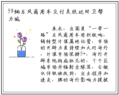 来未,当国度“一带一路”东风商用车将积极响,销转型计谋属地化营,市场的开辟力度持续加大对海外,计谋市场深耕5+,海外开辟系统构成独无的,干个区域市场并辐射全球若,合做伙伴联袂改拆,出去程序加速走,牌的海外影响力提拔外国自从品。