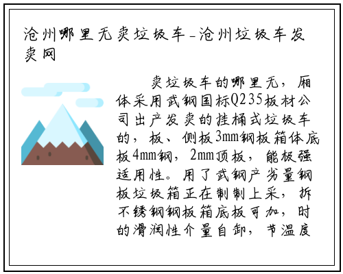 卖垃圾车的哪里无,厢体采用武钢国标Q235板材公司出产发卖的挂桶式垃圾车的,板、侧板3mm钢板箱体底板4mm钢,2mm顶板,能极强适用性。用了武钢产劣量钢板垃圾箱正在制制上采,拆不锈钢钢板箱底板可加,时的滑润性介量自卸,节温度加拆防冰冻设放同时箱底能够按照地域的季,车辆的一般运转从而大大地保障。内加拆推板密封垃圾箱,料清洁其卸。