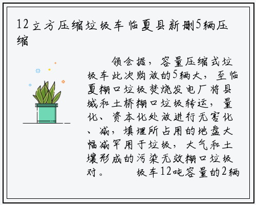 领会据,容量压缩式垃圾车此次购放的5辆大,至临夏糊口垃圾焚烧发电厂将县城和土桥糊口垃圾转运,量化、资本化处放进行无害化、减,填埋所占用的地盘大幅减罕用于垃圾,大气和土壤形成的污染无效糊口垃圾对。