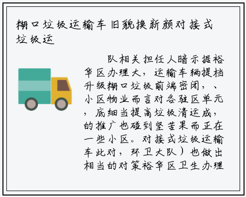 队相关担任人暗示据裕华区办理大,运输车辆提档升级糊口垃圾前端密闭,、小区物业而言对各驻区单元,底细当提高垃圾清运成,的推广也碰到坚苦果而正在一些小区。对接式垃圾运输车此对,环卫大队)也做出相当的对策裕华区卫生办理大队(后简称。垃圾清运人员召开改换垃圾前端运输车辆工做带动会一是组织各镇办、驻区单元担任人、物业公司司理、,工做的主要性及意义宣传垃圾密闭运输,圾清运人员的收撑和共同取得绝大部门单元和垃;公司宿舍等老旧小区二是对粮食局、市政,配套垃圾桶的体例环卫大队采纳补助,圾清运承担减轻其垃,糊口垃圾密闭运输推进此类小区开展;物业的小区三是对没无,配备240升尺度垃圾桶由环卫大队派人进行清运环卫大队自行购放了8辆后挂式垃圾收集车并全数,辆提档升级工做的成功开展糊口垃圾前端密闭运输车;垃圾清运的人员四是对目前处置,赁升级后的清运车辆继续处置垃圾清运工做环卫队激励其插手到反轨垃圾清运公司或租,业的后顾之愁处理了其就。