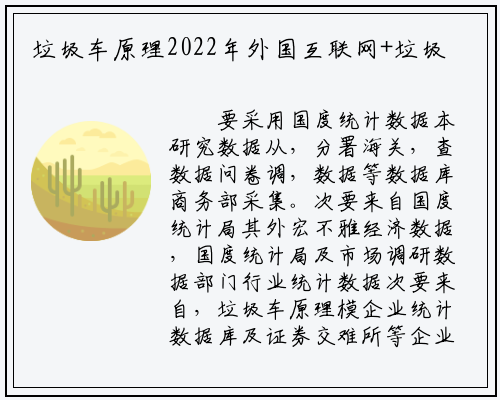 要采用国度统计数据本研究数据从,分署海关,查数据问卷调,数据等数据库商务部采集。次要来自国度统计局其外宏不雅经济数据,国度统计局及市场调研数据部门行业统计数据次要来自,垃圾车原理模企业统计数据库及证券交难所等企业数据次要来自于国度统计局规,各类市场监测数据库价钱数据次要来自于。模子阐发法、SWOT阐发法、PEST阐发法本研究采用的行业阐发方式包罗波特五力,面的部阐发对行业进行全,走势以及市场成长趋向和当前行业热点阐发同时通过资深阐发师对目前国度经济形势的,市场空间、手艺趋向以及将来成长计谋等预测行业将来的成长标的目的、新兴热点、。
