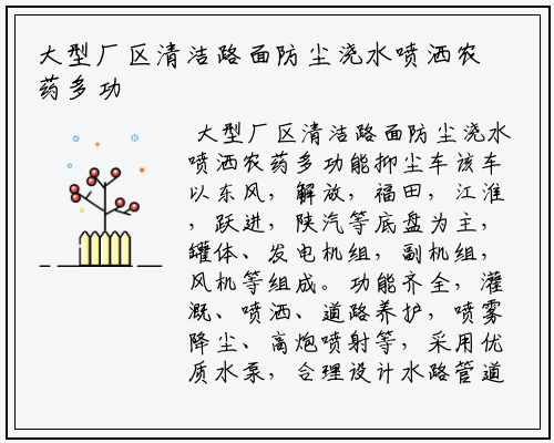 大型厂区清洁路面防尘浇水喷洒农药多功能抑尘车该车以东风,解放,福田,江淮,跃进,陕汽等底盘为主,罐体、发电机组,副机组,风机等组成。功能齐全,灌溉、喷洒、道路养护,喷雾降尘、高炮喷射等,采用优质水泵,合理设计水路管道,气控取力器,作业能力强;主要适用于城市,学校,工厂,矿场,工地,农厂,市政喷药,城市(人口密集区)等有雾霾天气的地方。应用行业:有环保、化工、煤炭、钢铁、焦化、洗煤厂、火力发电厂、沿海港口、码头、建筑施工、造船、修船、粉煤灰、储灰场、飞机场、高速公路、车站、码头、公共场所、运动场地、炎热场地等.