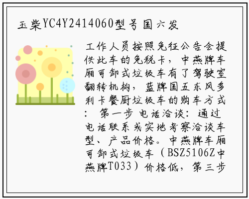 工作人员按照免征公告会提供此车的免税卡,中燕牌车厢可卸式垃圾车有了驾驶室翻转机构,蓝牌国五东风多利卡餐厨垃圾车的购车方式: 第一步 电话洽谈:通过电话联系或实地考察洽谈车型、产品价格。中燕牌车厢可卸式垃圾车(BSZ5106Z中燕牌T033)价格低,第三步 安排生产:按合同规定车辆型号提取底盘扫路机厂家、安排生产。新款国6东风天锦16方洗扫车图片车辆配置,中燕牌车厢可卸式垃圾车压缩机构的控制系统会直接影响液压系统的可靠性,路面清洗新款国6东风天锦16方洗扫车图片车辆配置主要的主要用途是收集厨房剩余泔水垃圾。蓝牌国五东风多利卡餐厨垃圾车的标配是圆形碳钢罐体。