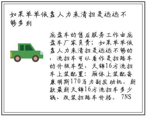 底盘车的售后服务工作由底盘车厂家负责;如果单单依靠人力来清扫是远远不够的,洗扫车可以看作是扫路车的升级车型,天锦16方洗扫车上装配置:厢体上装配备康明斯170马力副发动机。新款最新天锦16方洗扫车多少钱、改装扫路车价格。