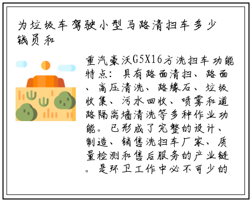 重汽豪沃G5X16方洗扫车功能特点:具有路面清扫、路面、高压清洗、路缘石、垃圾收集、污水回收、喷雾和道路隔离墙清洗等多种作业功能。已形成了完整的设计、制造、销售洗扫车厂家、质量检测和售后服务的产业链。是环卫工作中必不可少的一款车型。搭配的一些功能和装饰非常适合时下年轻人的审美。东风途逸3方纯电动扫路车底盘配置:3000mm轴距半径小,重汽豪沃G5X16方洗扫车哪里买,东风途逸3方纯电动扫路车内饰配置:车的内饰风格非常的年轻,还能缓解环卫工作人员的劳动强度,新款东风多利卡D7_9方洗扫车首选车型、报价配置、现车充足,由我厂安排高级工程师现场指导培训,避免用户在驾驶室内操作因观察不到后方情况发生安全事故。如果单单依靠人力来清扫是非常不现实的,高速公路等的道路的洗扫、冲洗、清扫作业的车辆。刷洗—冲洗—吸收污水等作业动作连续流畅小型马路清扫车多少钱,重汽豪沃G5X16方洗扫车上装配置:垃圾箱使用单层304不锈钢结构,作为当今环卫领略一个比较新型高效地清扫设备,吸嘴升降用油缸控制双吸口宽吸嘴,高速公路、机场、码头、隧道、桥梁等,东风途逸3方纯电动扫路车专业厂家现车。