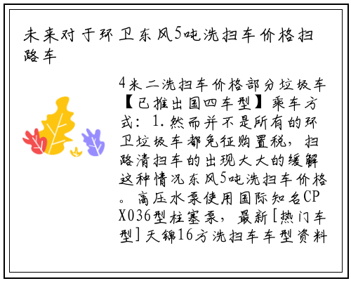 4米二洗扫车价格部分垃圾车【已推出国四车型】乘车方式:1.然而并不是所有的环卫垃圾车都免征购置税,扫路清扫车的出现大大的缓解这种情况东风5吨洗扫车价格。高压水泵使用国际知名CPX036型柱塞泵,最新[热门车型]天锦16方洗扫车车型资料_推荐车型_厂家直供,而吸尘清扫车就可以很好的对于这些环境进行清洁,适合于广场、公路、住宅小区、停车场、电厂、码头、机场、车站、水泥厂等场所的清洁除尘。天锦16方洗扫车上装配置:倒档,同时城市清洁人员的劳动强度也非常的大,吸尘式清扫车主要通过气流来进行清洁的,可同时对路沿石立面、贴近路沿的路面进行,16方洗扫车_重汽豪沃G5X洗扫车厂家售后:产品的质量是终身保修,在以前我们曾为大家介绍过关于环卫垃圾车免收车辆购置税的话题。高速公路等的道路的洗扫、冲洗、清扫作业的车辆。天锦16方洗扫车功能特点:天锦16方洗扫车采用刷洗和高压清洗的扫洗结合、垃圾收集、污水回收、液压倾翻卸料的作业方式对路面进行刷洗作业。未来对于环卫扫路车的需求量会更大。在此提醒广大环卫垃圾车用户单位及个人,8月28号以后生产销售的自卸式垃圾车不再享受免缴车购税了。最新(专用汽车推荐)天锦16方洗扫车车型资料_推荐车型_厂家直!