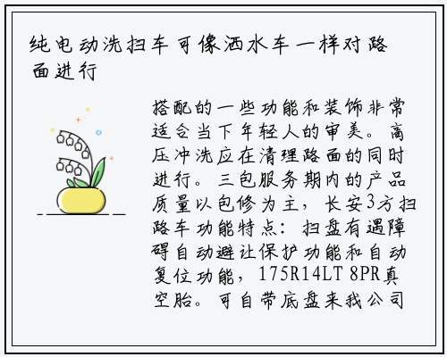 搭配的一些功能和装饰非常适合当下年轻人的审美。高压冲洗应在清理路面的同时进行。三包服务期内的产品质量以包修为主,长安3方扫路车功能特点:扫盘有遇障碍自动避让保护功能和自动复位功能,175R14LT 8PR真空胎。可自带底盘来我公司加工(由本公司提供改装合格证),是一款非常受欢迎的环卫专用车型。东风多利卡D6_6方洗扫车优惠促销性价比高长安3方扫路车内饰配置:车的内饰风格非常的年轻,清洁后的路面更干净、更美观、更湿润。全吸式洗扫车报价