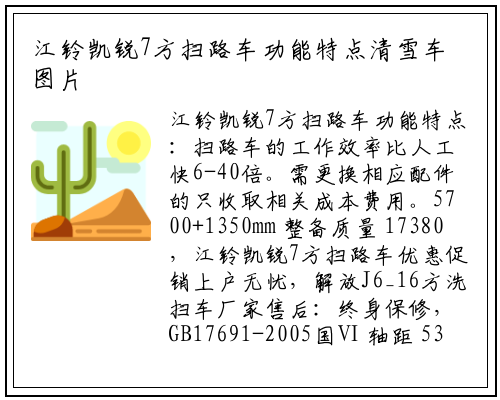 江铃凯锐7方扫路车功能特点:扫路车的工作效率比人工快6-40倍。需更换相应配件的只收取相关成本费用。5700+1350mm 整备质量 17380,江铃凯锐7方扫路车优惠促销上户无忧,解放J6_16方洗扫车厂家售后:终身保修,GB17691-2005国Ⅳ 轴距 5350+1300。