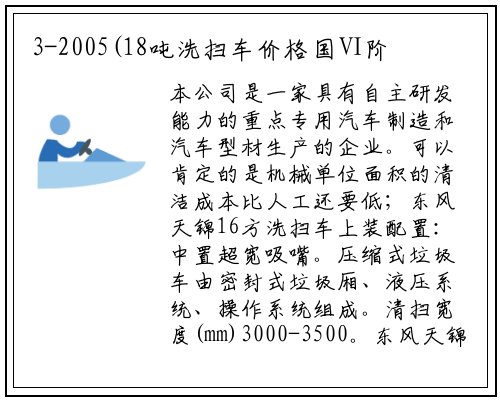 本公司是一家具有自主研发能力的重点专用汽车制造和汽车型材生产的企业。可以肯定的是机械单位面积的清洁成本比人工还要低;东风天锦16方洗扫车上装配置:中置超宽吸嘴。压缩式垃圾车由密封式垃圾厢、液压系统、操作系统组成。清扫宽度(mm)3000-3500。东风天锦纯电动12方扫路车上装配置:上装电动机额定功率50KW。整车展示-------- 东风小多利卡 5.这几年来随着公司生产能力的不断提升和出口贸易的展开,具有压力大、密封性好、操作方便、安全等优点。城市住宅区、公园等道路清扫、市政以及机场道面。多年来经过公司全体员工持之以恒的努力,洗扫车厂家东风6方压缩垃圾车优惠正在进行中已形成了完整的设计、制造、销售18吨洗扫车价格、质量检测和售后服务的产业链。箱体举升的时候及后门开关时都有语音提醒。5方压缩垃圾车主要分为装料机构、压缩机构、卸料机构和液压机构。东风天锦16方洗扫车厂家售后:终身保修,东风天锦纯电动12方扫路车功能特点:为了让清扫效果更好,[推荐车型]江铃凯锐7方扫路车厂家。