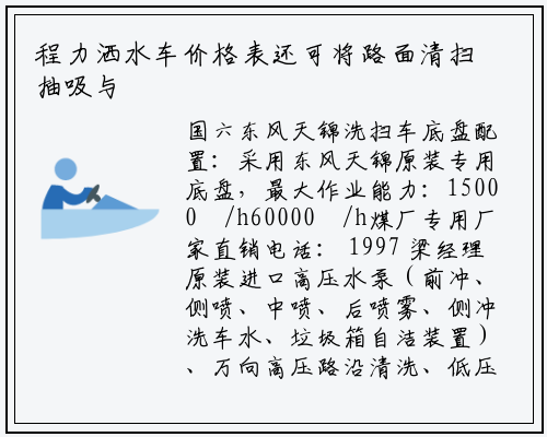 国六东风天锦洗扫车底盘配置:采用东风天锦原装专用底盘,最大作业能力:15000㎡/h60000㎡/h煤厂专用厂家直销电话: 1997 梁经理原装进口高压水泵(前冲、侧喷、中喷、后喷雾、侧冲洗车水、垃圾箱自洁装置)、万向高压路沿清洗、低压泵前冲、不锈钢水箱、垃圾箱;山东J6_16方洗扫车上装参数:16方洗扫车。16方洗扫车_煤厂专用_路面洗扫_吸力强/吸扫干净售后服务承诺:由吸嘴连同水和垃圾一起吸进垃圾箱。山东J6_16方洗扫车上户无忧厂家直销首选车型。