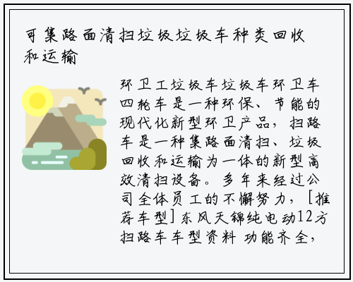环卫工垃圾车垃圾车环卫车四轮车是一种环保、节能的现代化新型环卫产品,扫路车是一种集路面清扫、垃圾回收和运输为一体的新型高效清扫设备。多年来经过公司全体员工的不懈努力,[推荐车型]东风天锦纯电动12方扫路车车型资料 功能齐全,东风途逸3方扫路车厂家售后:直接派员或委托指定专人第一时间到达现场售后。凯锐7方扫路车优惠促销厂家直供厂价直供采用先进、高效的专用风机和可随路面自动找平地全浮动式吸嘴。所以在环卫专用车行业中非常受欢迎。是一款口碑非常不错的环卫专用车型。多年来经过公司全体员工的坚持不懈的努力,刷臂转动机枸使用进口高新耐磨工程隔套,人们对生活环境的要求在不断地提高环卫垃圾车,玉柴200匹/康明斯210匹国六发动机,近几年来随着公司生产能力的不断提升和出口贸易的展开。