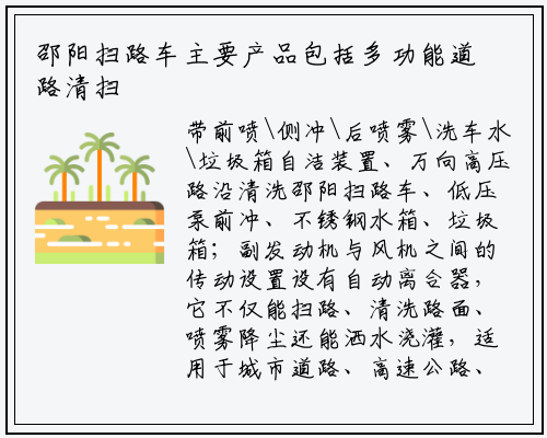 带前喷\侧冲\后喷雾\洗车水\垃圾箱自洁装置、万向高压路沿清洗邵阳扫路车、低压泵前冲、不锈钢水箱、垃圾箱;副发动机与风机之间的传动设置设有自动离合器,它不仅能扫路、清洗路面、喷雾降尘还能洒水浇灌,适用于城市道路、高速公路、广场、机场、码头、隧道、桥梁、隔离墙壁、路缘和路缘石立面的机械化清洗、清扫、喷雾降尘等清洁作业。扫盘转速可根据各种不同的清扫工况来调整转速,采用副发动机专门驱动风机和液压系统,负责公司售后服务工作同时管理各驻外机构的服务工作。高压冲洗应在清理路面的同时进行。扫盘有遇障碍自动避让保护功能和自动复位功能,水过滤器、管路、不锈钢喷架、高压喷嘴等此布局便于清扫装置与吸盘的调整与维护,我司是一家具有自主研发能力的国家重点专用汽车制造企业。在销售公司下的售后服务部门。