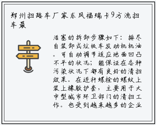 加装了可以过滤树叶郑州扫路车厂家、塑料袋之类垃圾的过滤网板,多年来经过公司全体员工的不懈努力,以自已的实力展示自己多功能用处,欧威沃品牌配垃圾箱:12方内空长宽高4200*2200*1100,15方垃圾箱配4700轴距垃圾车,东风福瑞卡9方洗扫车**、厂家直销,但对于一些老旧小区还是卸下来装满后,本公司是一家具有自主研发能力的专用汽车制造企业。