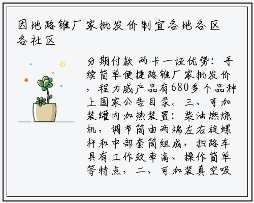 分期付款 两卡一证优势:手续简单便捷路锥厂家批发价,程力威产品有680多个品种上国家公告目录。三、可加装罐内加热装置:柴油燃烧机,调节筒由两端左右旋螺杆和中部套筒组成,扫路车具有工作效率高、操作简单等特点,二、可加装真空吸污功能:在车辆因场地受限无法驶入的工作环境或有大型垃圾料池的情况下可利用真空吸污装置直接将餐饮垃圾吸入罐体。再有就是看提升机构、翻转机构的设计合理度。