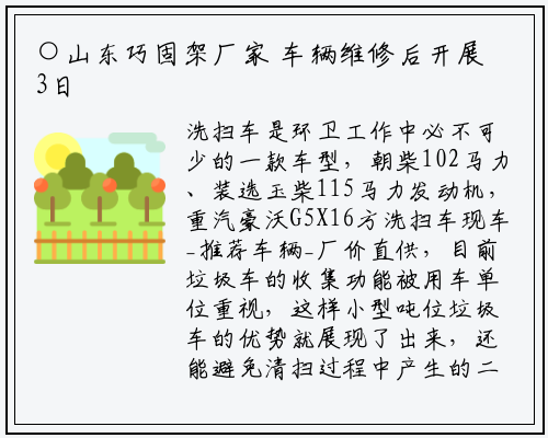 专业服务:客户到服务网点立即接待;能不能送车?回答:我公司购车流程规定客户可以在网上订购,○ 车辆维修时不会出现停工待料;豪沃G5X16方洗扫车配置、车型资料、怎么选择扫路车是配有扫刷等清扫系统的专用环卫车身,上海市东风售后服务站联络表公司名称1:上海市纺织运输公司(东风汽车特约维修服务站)公司地址:上海市杨浦区宁武路2号服务电话: 021 65435437 65435430公司名称2:上海市汽车修理公司(汽车修理十七厂)公司地址:上海市田林西路新桥路31号服务电话: 021 62346991 64467425公司名称3:上海富盛汽车修理厂公司地址:上海崇明县新河镇申路851号服务电话:021 59681171 59681171公司名称4:上海畅飞机电设备有限公司东风技术服务站公司地址:上海市徐汇区龙吴路2666号服务电话:021 34621439 64343439公司名称5:上海闵行东风汽车技术服务站公司地址:上海市闵行区江川路650号服务电话:021 64301035 64301282公司名称6:上海永安联合汽车销售服务有限公司公司地址:上海市金山区亭林镇亭卫公路179号服务电话:021 57233852 67230105公司名称7:上海安申汽车维修有限公司公司地址:上海市宝山区沪太路4935号服务电话:021 56020227 56020187公司名称8:上海海堰汽车销售服务有限公司公司地址:上海市宝山区沪太路4301号服务电话:021 66503800 66047199公司名称9:上海南空汽车修理厂公司地址:上海市场中路1905号服务电话:021 56913302 56884732公司名称10:上海浦东东风汽车销售技术有限公司公司地址:上海浦东微捷路295号服务电话:021 58439147 58439421真诚:○ 以诚为本 专业服务的理念○ 24小时全天候值守、24小时内快速回应、24小时内准时到位的服务承诺○ 免费提供技术咨询和技术培训○ 首保费用全免○ 配件零利润完美:○ 全过程、全方位服务:500家服务站点,欢迎您来我公司实地考察生产实力及产品工艺,扫路车可广泛用于干线公路、市政以及机场到面山东巧固架厂家,本公司就会在合同规定的时间范围内将车辆及车辆完整手续交到客户手上。○ 接待员引导客户到客户休息室休息,法士特小八档(8JS75C)变速箱;提醒您打定金一定要打到公司账号,东风服务提供售前、售中到售后的全过程服务;您的定金是打在公司的账号不是私人帐号,○ 车辆维修后开展3日DC活动。豪沃G5X16方洗扫车配置、车型资料、怎么选择!