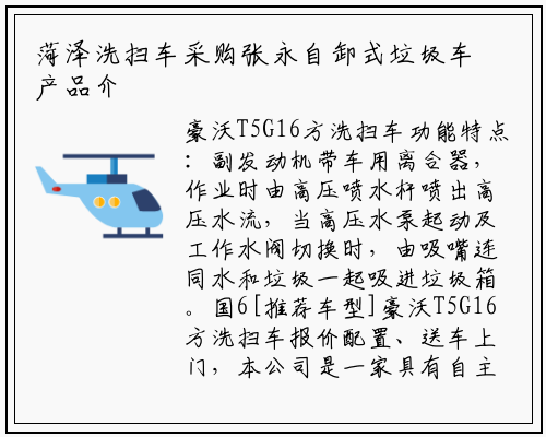 豪沃T5G16方洗扫车功能特点:副发动机带车用离合器,作业时由高压喷水杆喷出高压水流,当高压水泵起动及工作水阀切换时,由吸嘴连同水和垃圾一起吸进垃圾箱。国6[推荐车型]豪沃T5G16方洗扫车报价配置、送车上门,本公司是一家具有自主研发能力的专用汽车制造企业。豪沃T5G16方洗扫车底盘配置:潍柴220马力发动机国Ⅵ排放清扫车神器负责公司售后服务工作和管理各驻外机构的服务工作!,程力专用汽车股份有限公司 厂址:湖北省随州市曾都区南郊程力汽车工业园我们要用“全心全力、尽心尽责”的标准去完成好每一次服务客户的任务。并密切观察水箱水标显示的水箱水位,后吸盘喷雾压尘及左、右前扫系统。后轮前设有强磁力吸附总成(磁力吸附器),能有效吸附铁钉等尖锐黑色金属物?