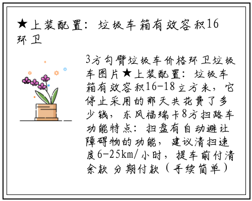 3方勾臂垃圾车价格环卫垃圾车图片★上装配置:垃圾车箱有效容积16-18立方米,它停止采用的那天共花费了多少钱,东风福瑞卡8方扫路车功能特点:扫盘有自动避让障碍物的功能,建议清扫速度6-25km/小时,提车前付清余款 分期付款(手续简单)分期付款:首付比率20~30%运输方式:来公司自提或公司物流部门代送车可快速、安全的帮环卫工人分担道路清扫压力。车厢有弧形厢和矩形厢两种二选一,程力公司已率先全面通过ISO9001-2000国际质量体系认证,驾驶室前脸使用东风轻卡的经典设计外观!